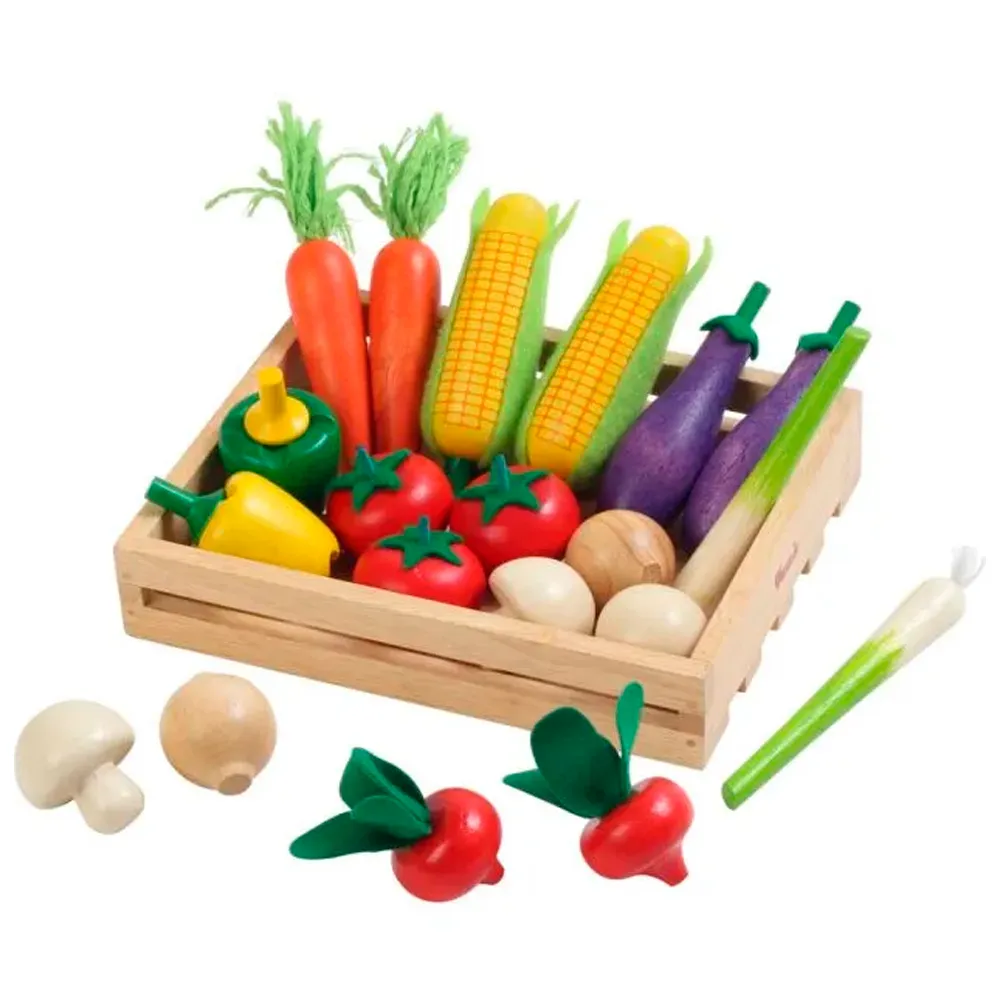 Canasta con diferentes vegetales de madera: 3 champiñones, 2 zanahorias, 2 berenjenas, 2 rabanitos, 2 cebollitas chinas, 2 choclos, 3 tomates, 1 pimiento amarillo, 1 pimiento verde.