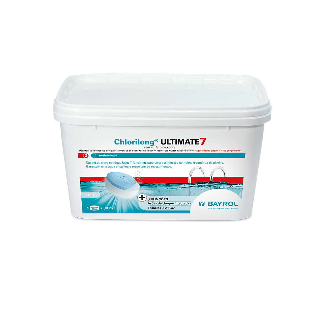 Chlorilong® ULTIMATE7 es una tableta de cloro de 300g para la desinfección del agua en 2 fases: tratamiento de choque del filtro de arena y desinfección permanente de la piscina. Esta tableta contiene un floculante para eliminar las partículas más finas y un estabilizador de la dureza para evitar la precipitación de la cal. Chlorilong® ULTIMATE7 actúa en 2 pasos:
