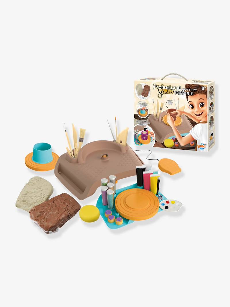 Un auténtico torno de alfarero especialmente adaptado para los niños. Con la ayuda de las instrucciones, aprenderán a hacer un cuenco, una olla o un plato ¡que luego podrán decorar! Se proporcionan 2 kg de arcilla que se seca al aire libre. Una pieza de color claro y otro marrón. ¿La clave del éxito? Un molde para dimensionar la cantidad de arcilla necesaria y centrarla en el torno para empezar bien la creación. Una vez realizada la pieza, solo habrá que reubicar el cajón para dejar secar la creación ¡y decorarla después!