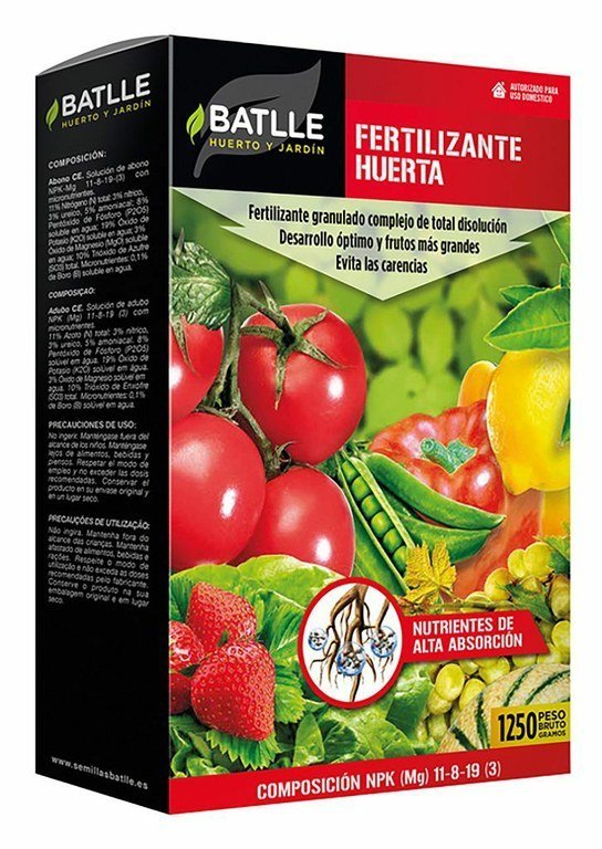 El Fertilizante Huerta Batlle es un abono granulado complejo, desarrollado especialmente para la nutrición de las hortalizas, tanto de hoja como de fruto, aportándoles los micro y macro nutrientes que estas plantas necesitan para conseguir un desarrollo máximo en el mínimo tiempo.