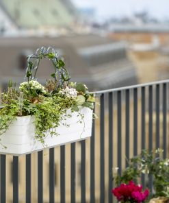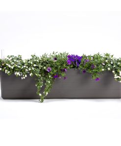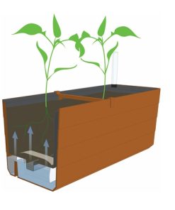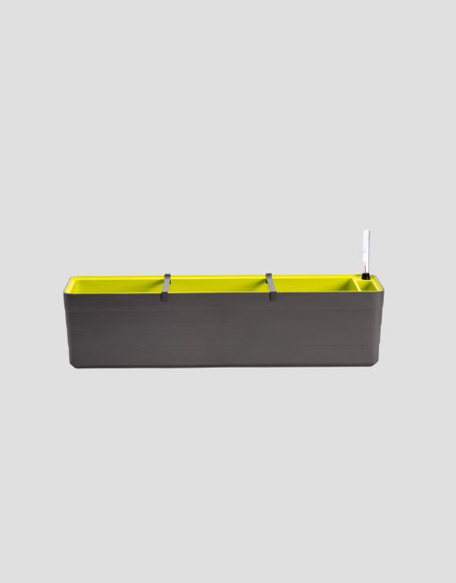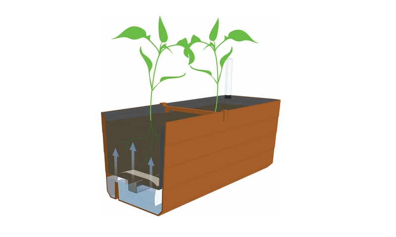 Las jardineras se componen de dos contenedores, con un espacio en la zona inferior que sirve de depósito de agua y desde donde llega el agua al sustrato a través del sistema de auto-riego que ofrece una dosificación del agua a la medida de las necesidades de la planta.