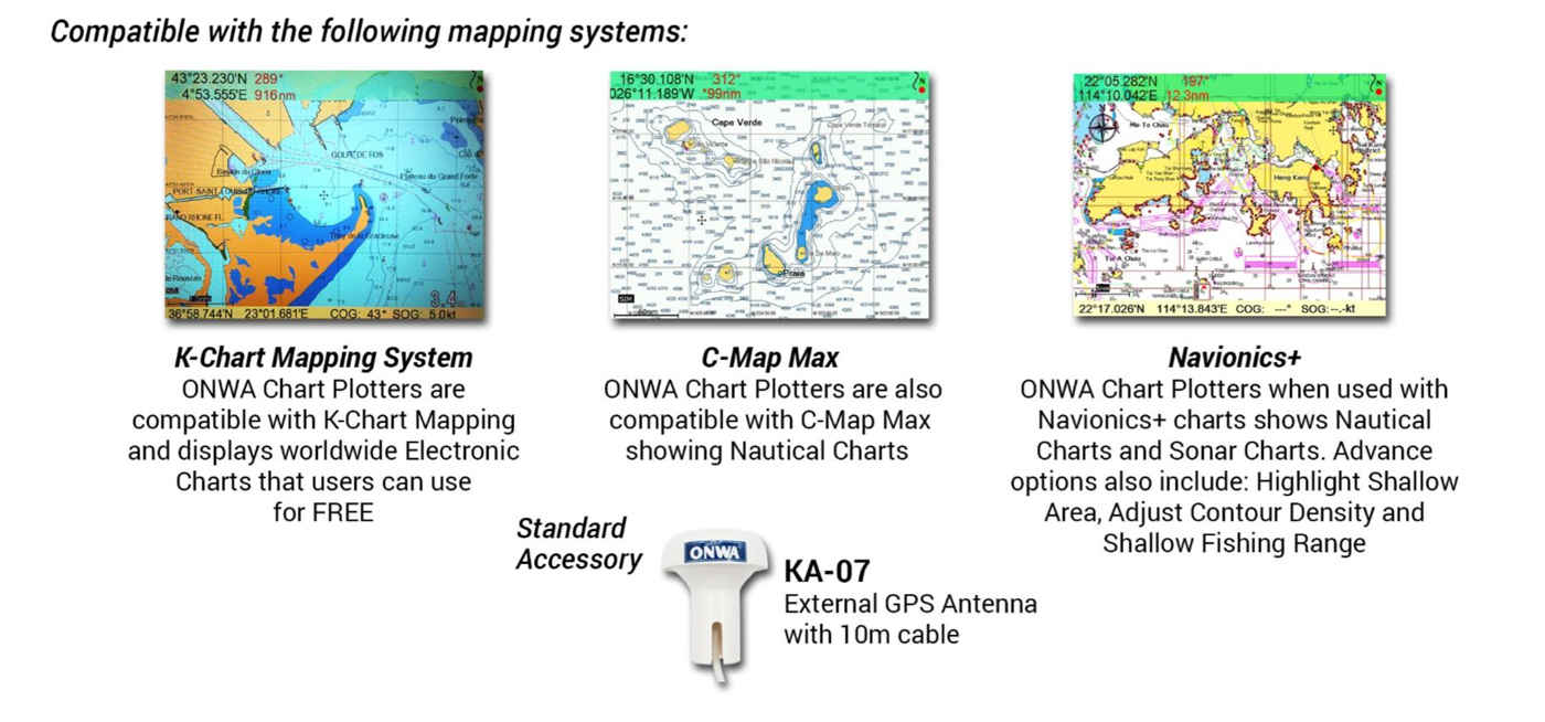 Soporta múltiples cartografías: K-Chart2 (incluida en el equipo sin cargo), Navionics+ (opcional) y CMap Max (opcional).