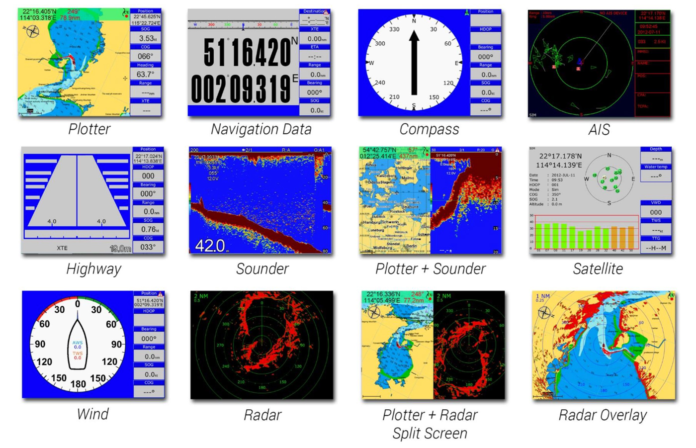 Dispone de varios modos de presentación: Ploter, radar, sonda, ploter+radar, radar overlay, ploter+sonda, GPS, viento, AIS, compas…