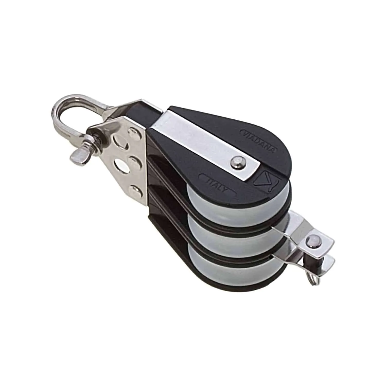 Polea 3 posiciones triple con arraigo fabricada en nylon y acero inoxidable