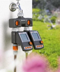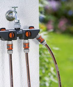 El distribuidor de dos vías GARDENA permite conectar a la vez dos accesorios a un grifo. Las salidas son totalmente regulables. Pueden conectarse dos programadores de riego GARDENA al distribuidor.