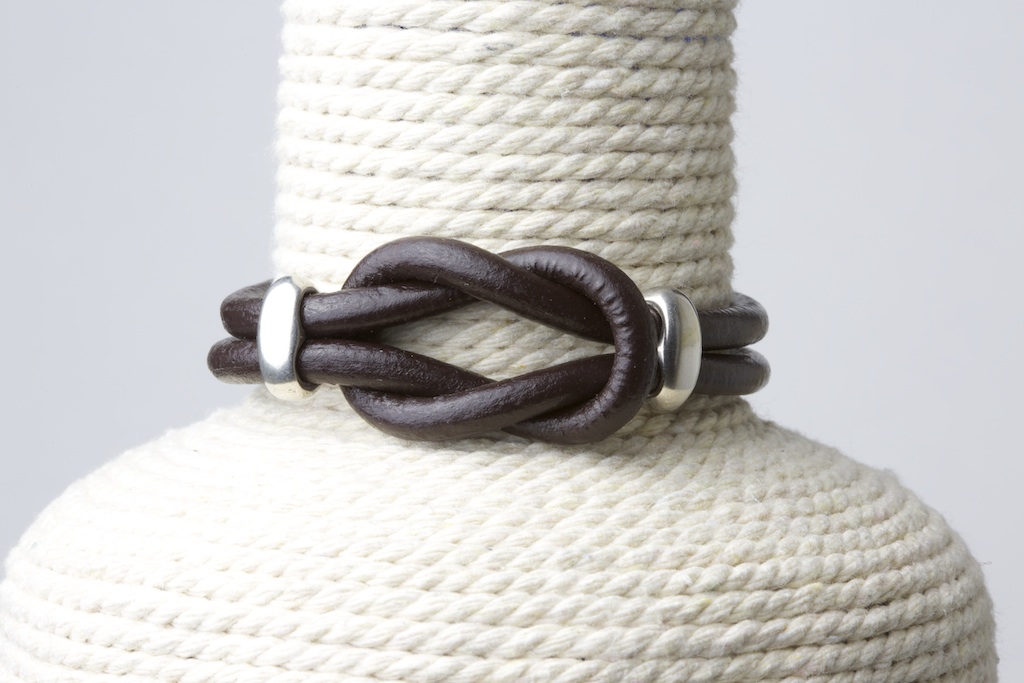 Pulsera artesanal hecha con cuero y piezas de zamak.
