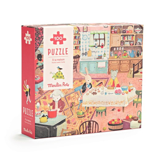 Disfrutar juntos montando este precioso puzzle de 100 piezas con escenas cotidianas en casa de los dulces personajes de la gran familia de Moulin Roty.