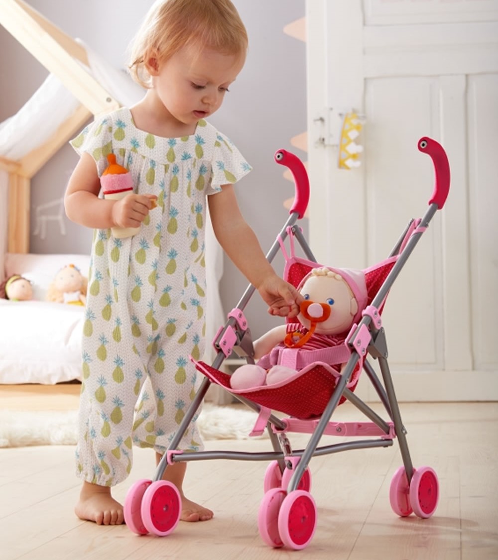 Con este cochecito manejable y plegable, los papás y las mamás de muñecas pueden llevar de paseo a sus muñecas o peluches y dar vueltas con ellas por todas partes.