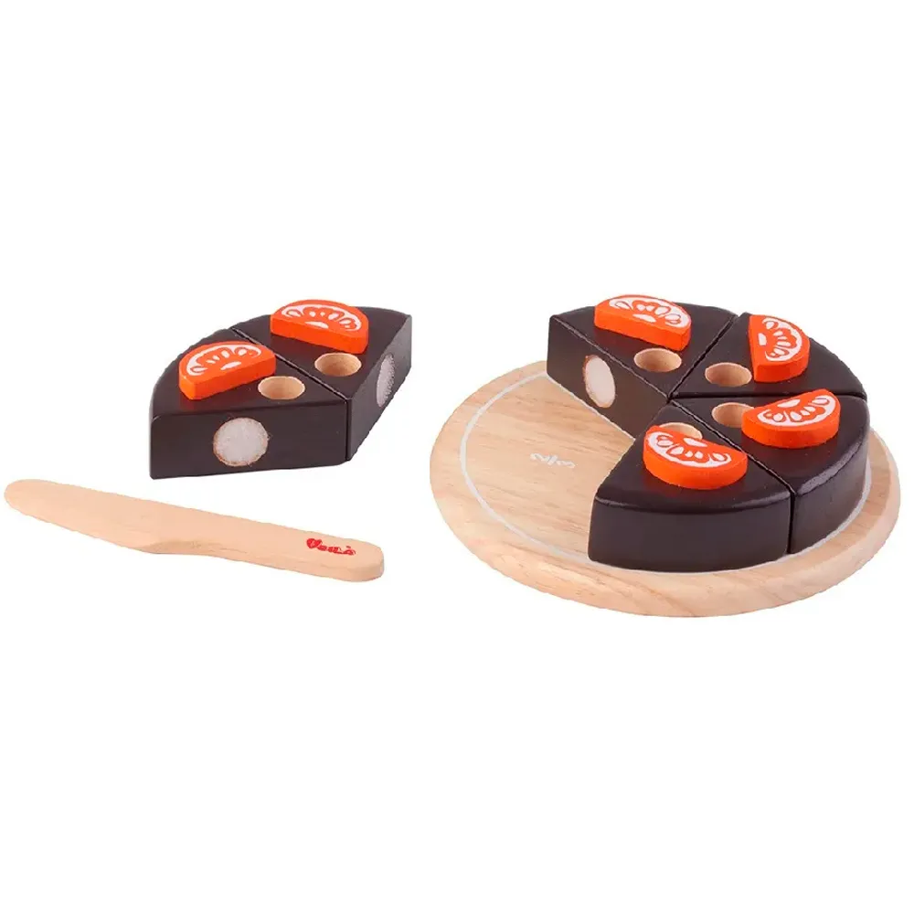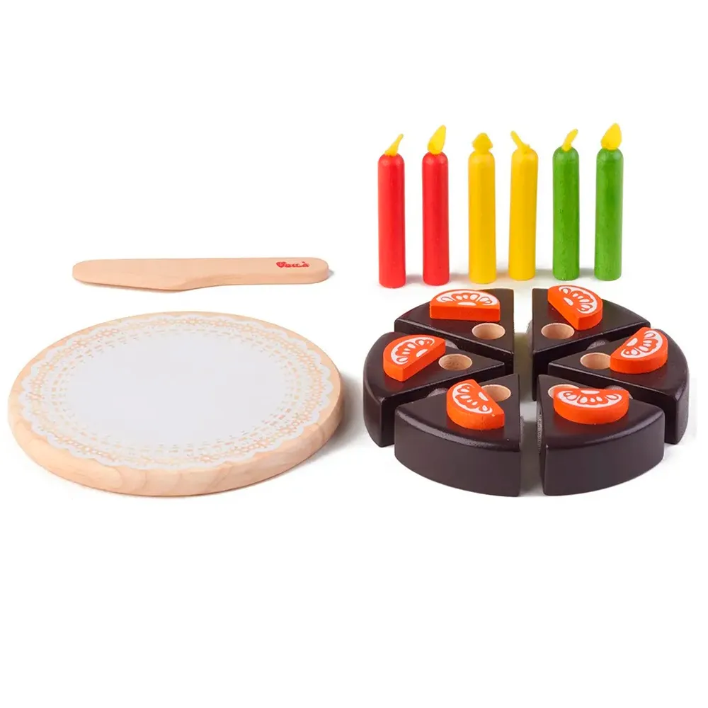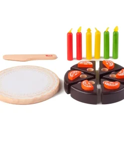 Esta torta de chocolate pequeña, decorada con 6 gajos de naranja y 6 velas, puede ser cortada en 6 pedazos usando el cuchillo de madera provisto.